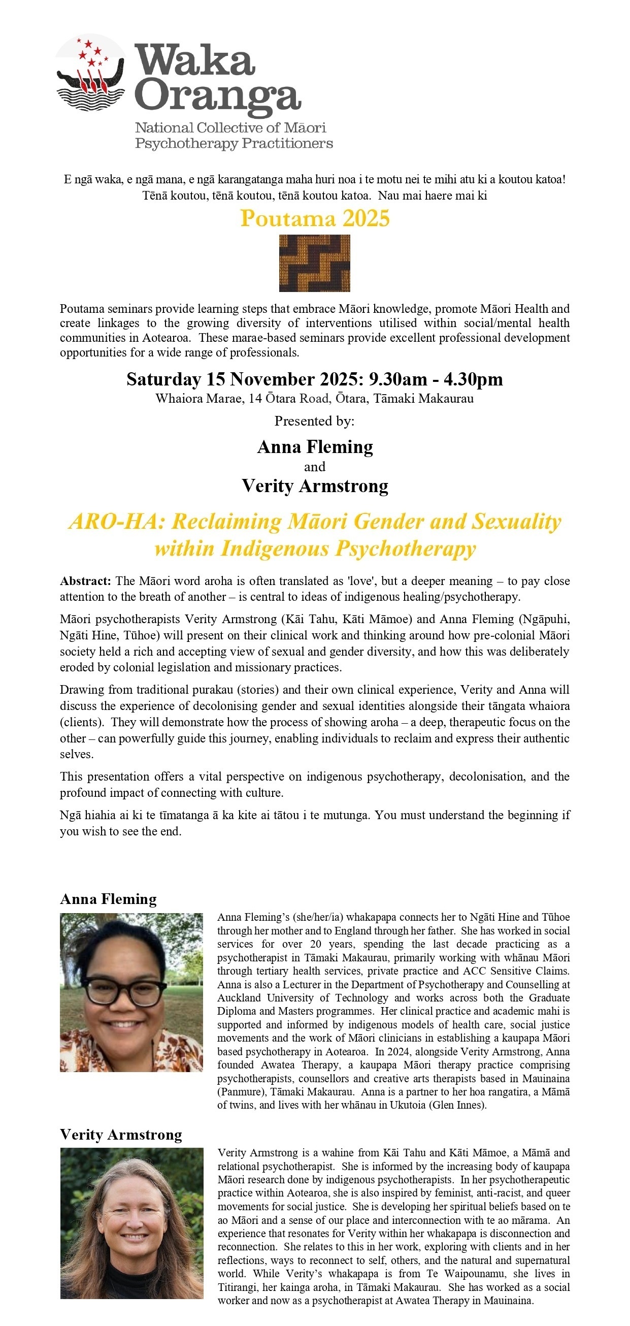 Drawing from traditional purakau (stories) and their own clinical experience, Verity and Anna will discuss the experience of decolonising gender and sexual identities alongside their tāngata whaiora (clients). They will demonstrate how the process of showing aroha – a deep, therapeutic focus on the other – can powerfully guide this journey, enabling individuals to reclaim and express their authentic selves.